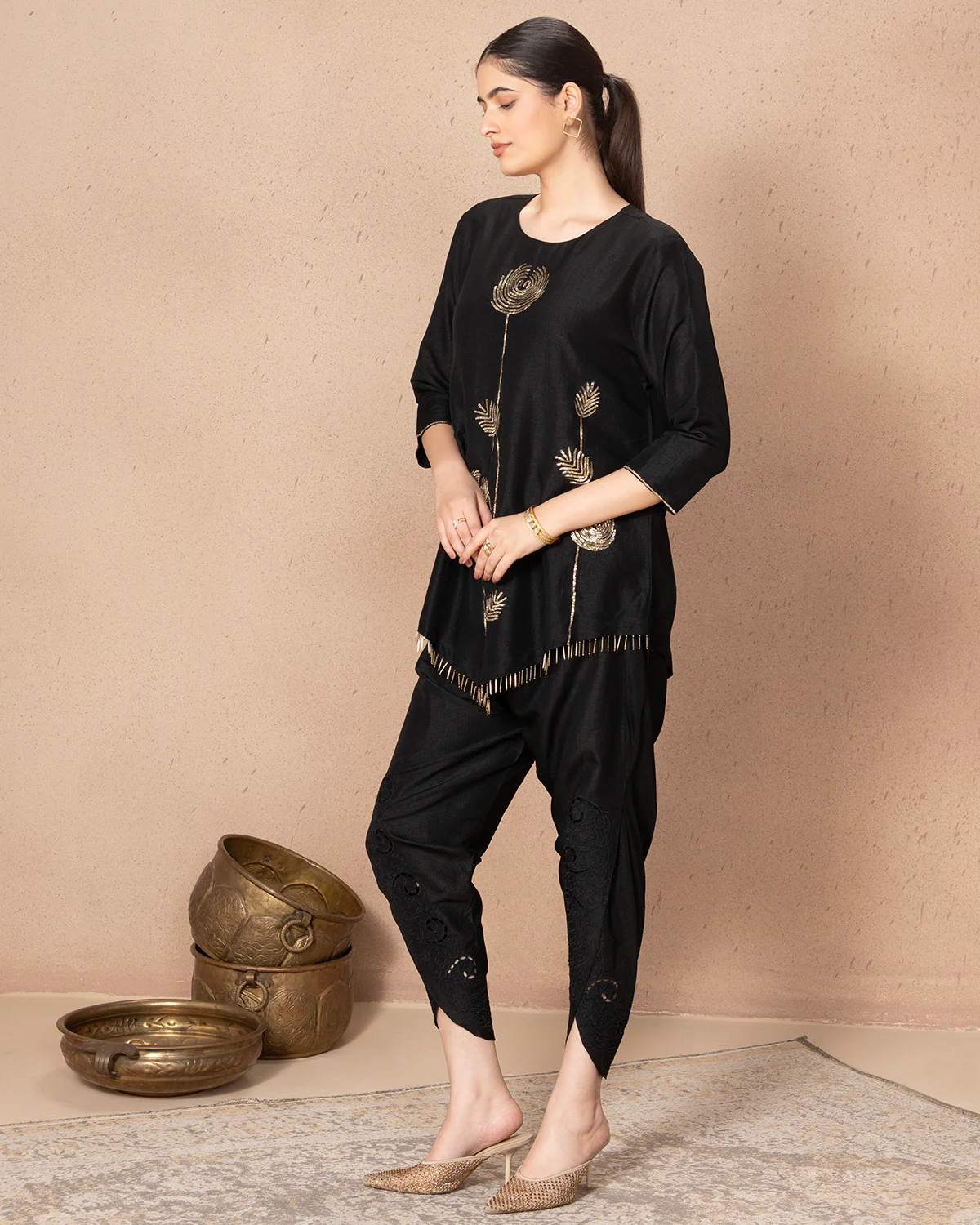 Elevate your style with this elegant black Russian silk top, featuring a slimming V-cut and intricate dabka pita work
